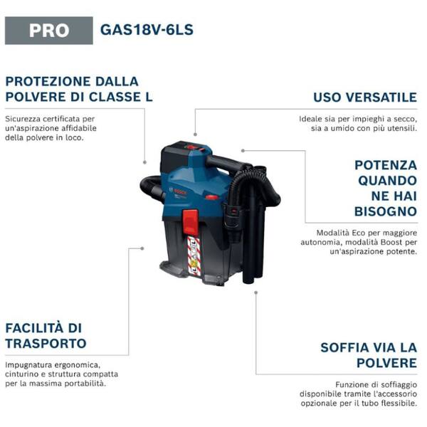 Aspiratore a batteria a secco Bosch Professional GAS 18V-6LS | Ferramenta Veneta Srl