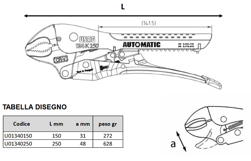 Pinza regolabile USAG 134 K autobloccante automatica - lunghezza 150mm